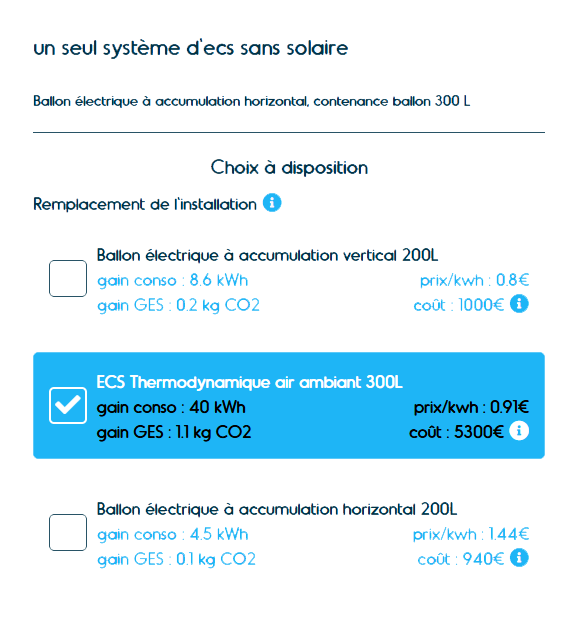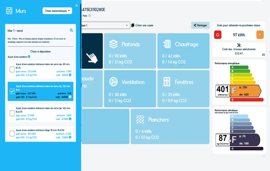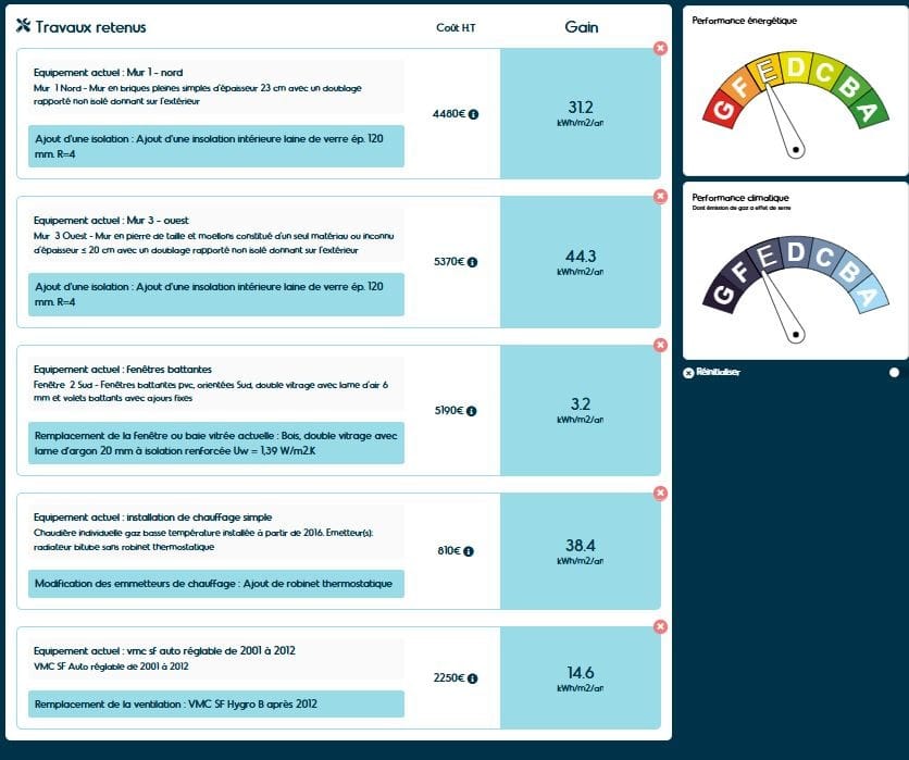 En fonction de ces données, le simulateur refais le calcul et modifiant la constitution du logement selon votre propre choix et affiche la nouvelle une classe énergétique (de A à G) et une classe climat (de A à G). Cela permet de savoir si le geste travaux est suffisant pour atteindre la note souhaitée.